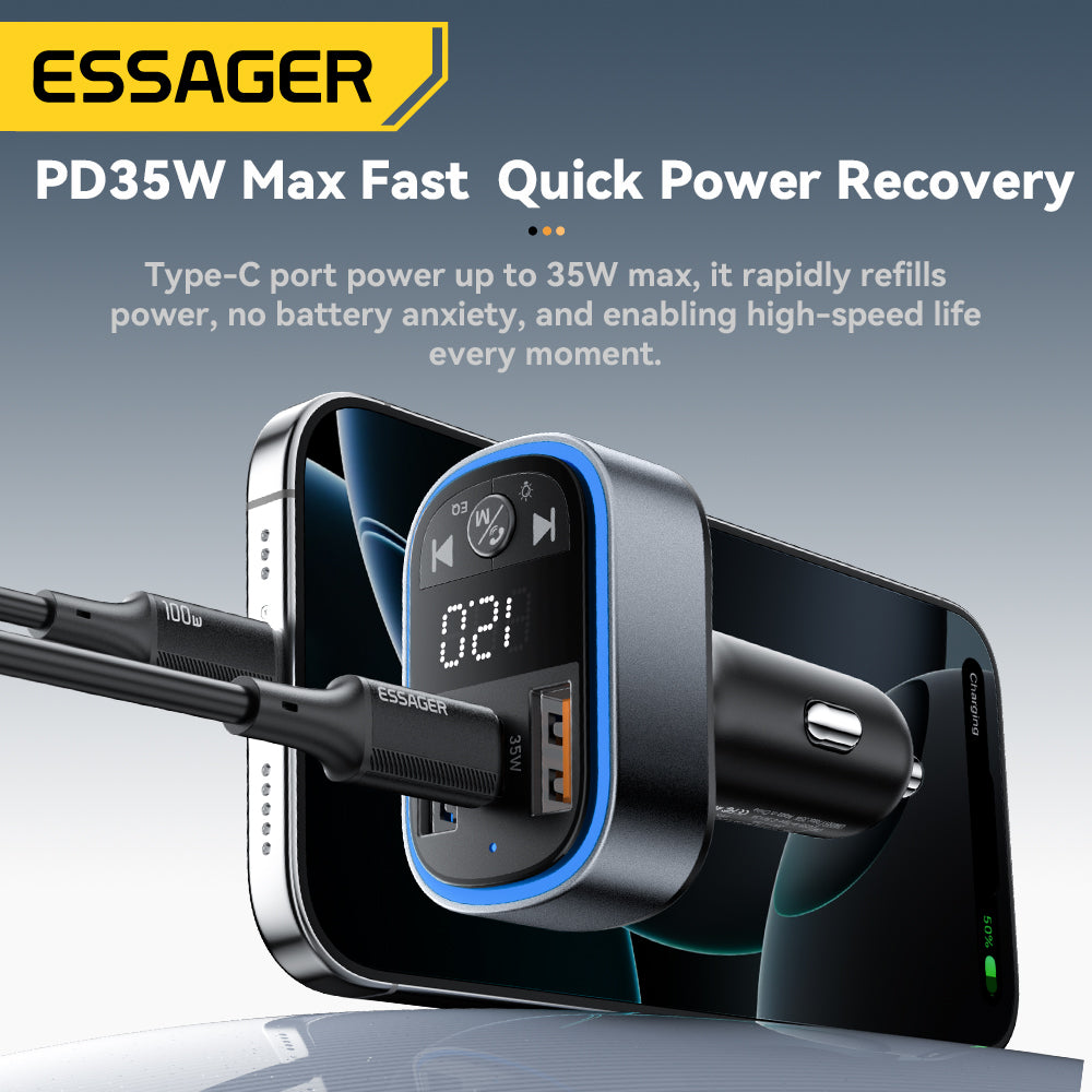 ESSAGER 35W FM Bluetooth Car Charger – MP3, Display, USB-C + A