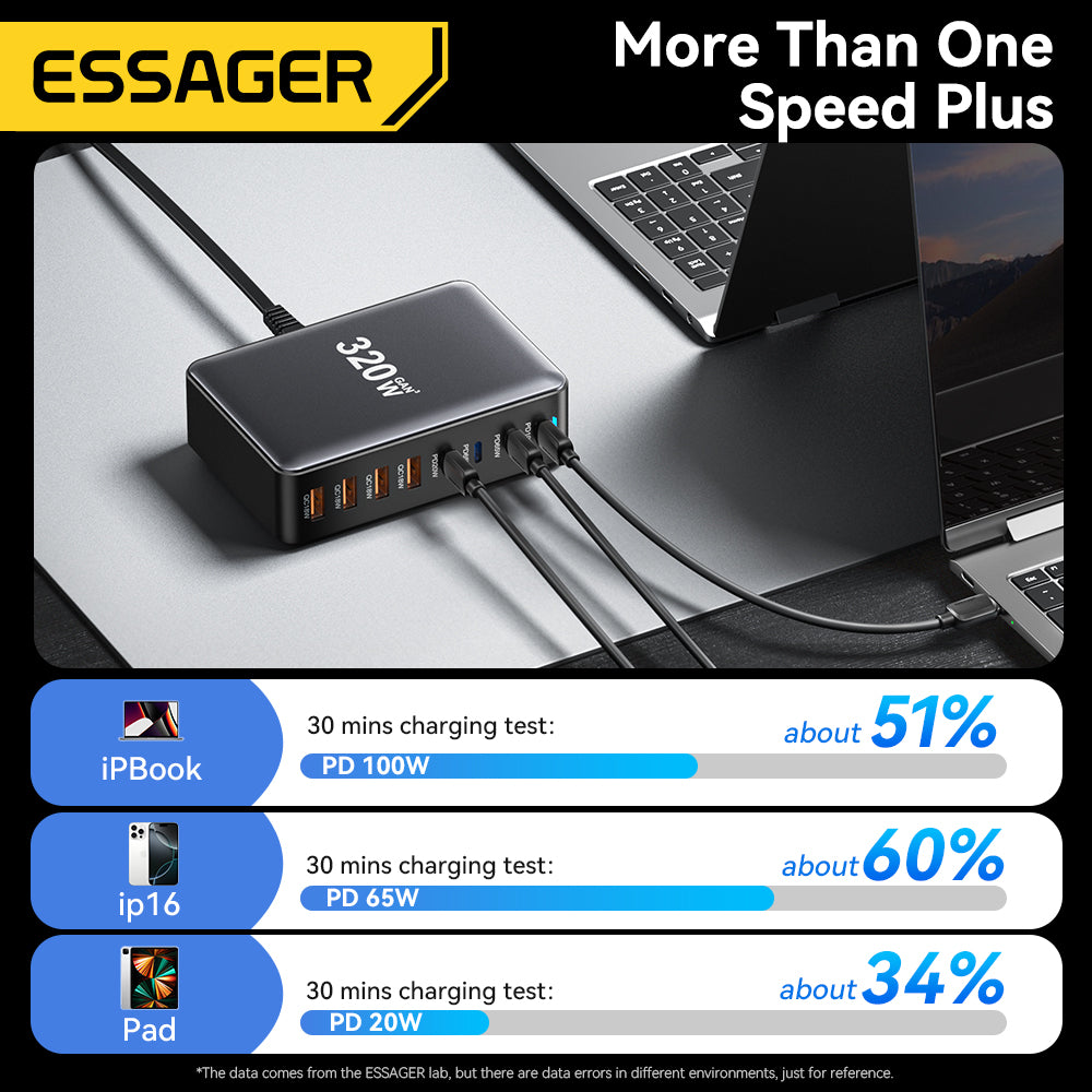 Essager 320W GaN Charger 8Port USB Type C Desktop Charging Station PD 100W Fast Charging For iPhone 16 15 14 iPad MacBook Laptop